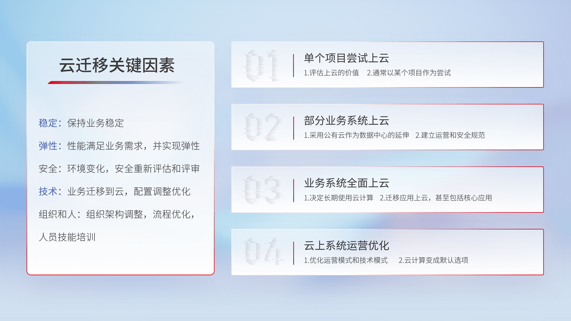 结合实际业务,,,从规划设计、、、云平台选型、、、、云原生改造、、数据迁移、、、集成交付,,,,迁移全过程为客户识别最佳上云路径,,,做好风险识别管理,,,,设计网络架构、、身份权限、、、、安全审计合规、、、操作审计、、日志审计、、、监控告警策略、、、多站点容灾设计等,,,对云上基础设施进行整体规划,,提升IT治理水平,,以满足弹性、、高可用、、、、高性能的需求。。。。