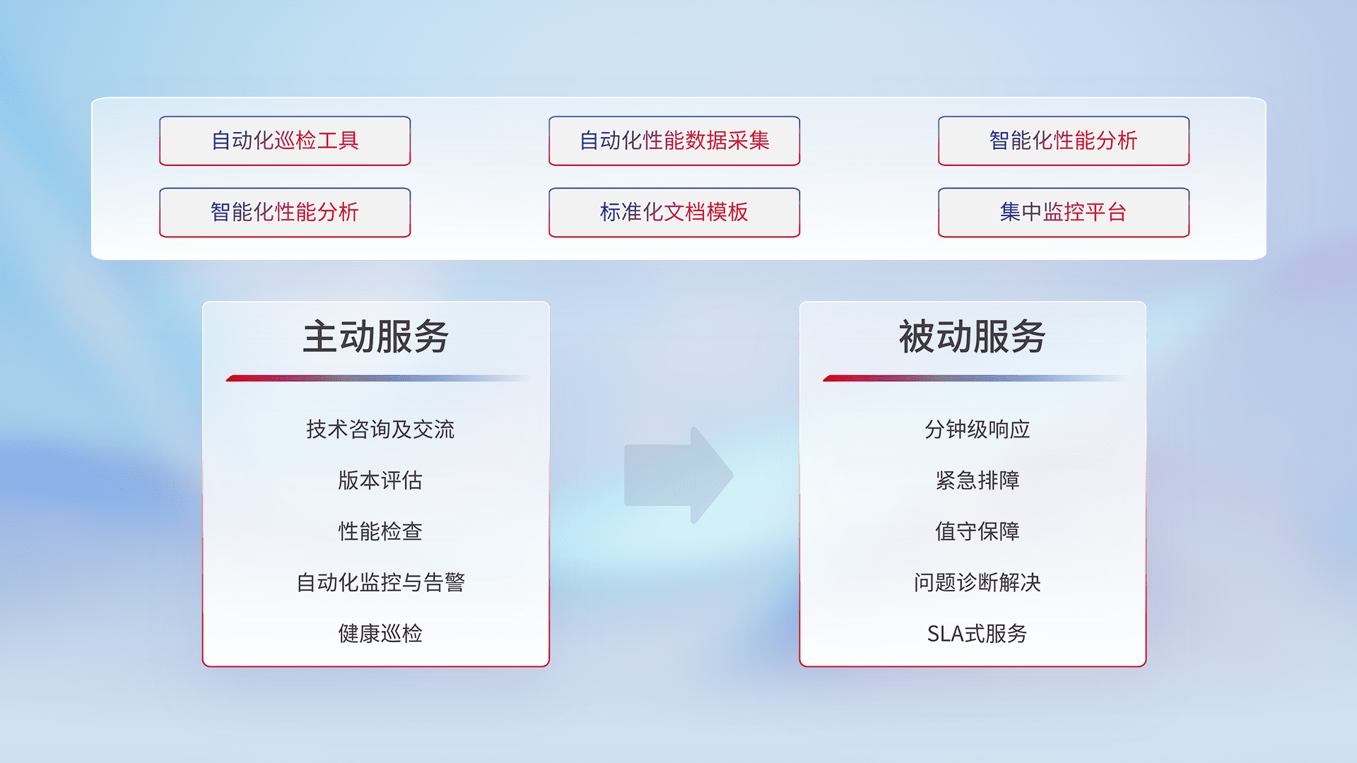 智能化工具和标准化文档,,保障服务质量,,,提供主动服务(包含技术咨询、、版本评估、、、、性能检查、、自动化监控与告警、、、、健康巡检)和被动服务包含(分钟级响应、、、紧急排障、、、值守保障、、问题诊断解决、、、SLA服务)。。。。
